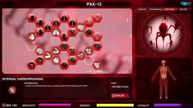 Dalam Plague Inc, pemain dapat mengembangkan penyakit mereka melalui sistem evolusi yang sangat mendalam. Penyakit dapat memperoleh berbagai kemampuan baru seperti peningkatan penyebaran melalui udara, air, atau hewan. Selain itu, pemain juga dapat menambahkan gejala tertentu yang membuat penyakit menjadi lebih mematikan. Namun setiap keputusan evolusi harus dipikirkan dengan hati hati. Jika penyakit terlalu cepat menunjukkan gejala mematikan, negara negara di dunia akan lebih cepat menyadari ancaman tersebut dan mulai melakukan penelitian untuk menemukan obat. Oleh karena itu, strategi yang efektif sering kali melibatkan penyebaran diam diam sebelum akhirnya membuat wabah menjadi sangat mematikan. Sistem evolusi ini membuat setiap permainan terasa berbeda karena pemain dapat mencoba berbagai pendekatan strategi.